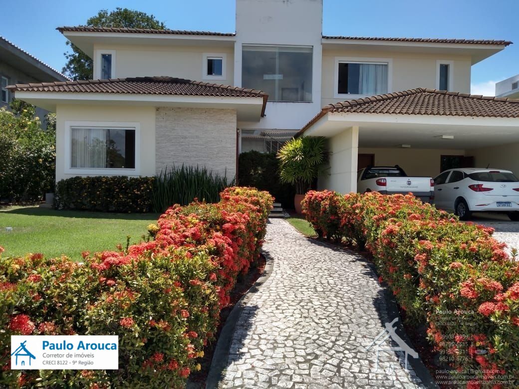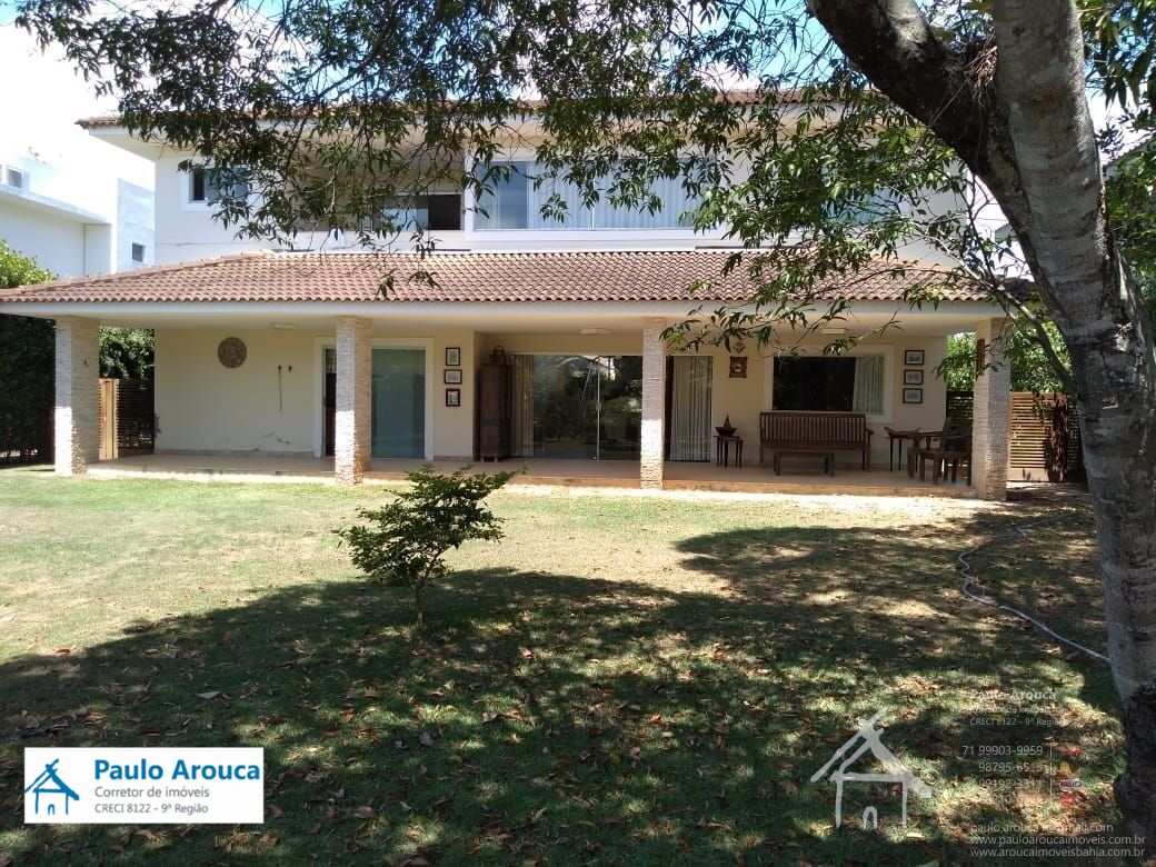 Casa à venda no Condomínio Busca Vida, duplex, nascente, terreno de 1000 m², 5 Quartos (4 suítes), 2 salas, 2 varandas, cozinha com despensa, área de serviço, depósito, quintal com árvores e garagem coberta para 2 carros e descoberta para 4.